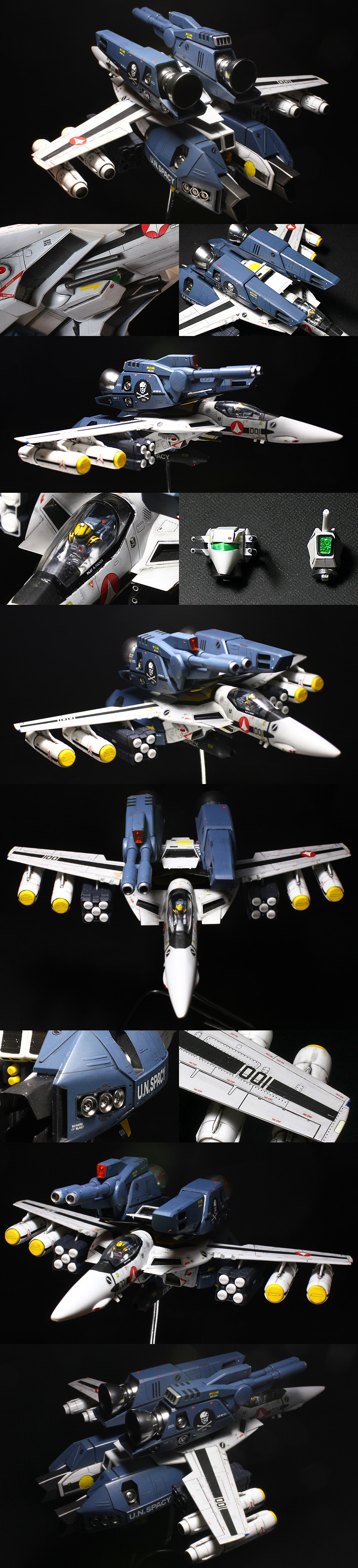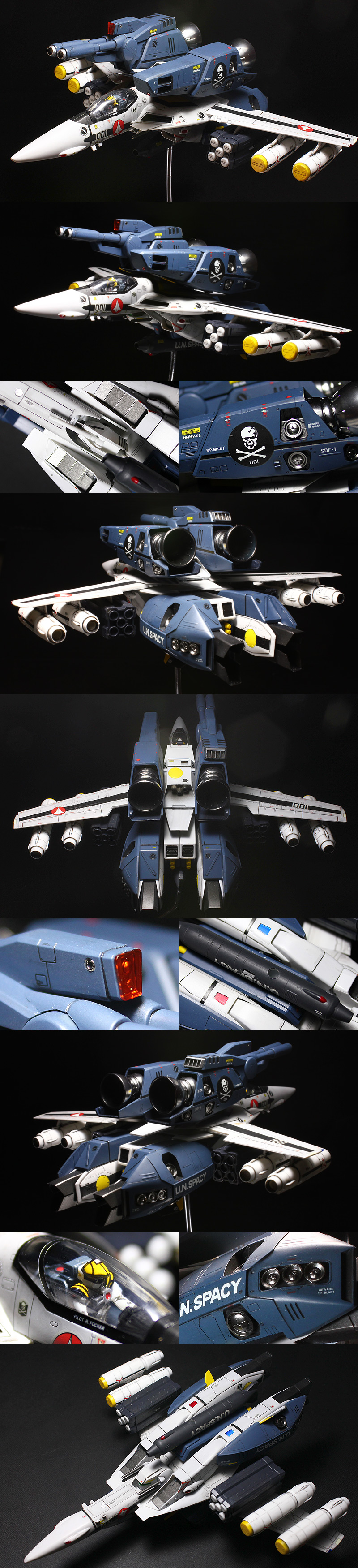 ★ライディングギアをオミットした飛行形態で製作しました。★頭部とビーム砲を差替え可能に改修しました。 ★キャノピーのパーティングラインを消しました。★合わせ目消し後、パネルラインを彫り直しました。 ★機体のベースカラーはサーフェイサー1200とホワイトを混色した、限りなく白に近い薄いグレーです。 ★スミ入れ後、気持ちウォッシング気味でスミを残してふき取り、やや使用感のある機体を演出しました。 ★ウエポンセットでパイロットと装備追加し、フル装備としました。主翼・搭載武器は接着固定しました。 ★オプションパックのバーニアパーツはメッキシルバーNEXTで塗装。金属パーツのような輝きです。 ★NO STEPやDANGERなどの極小デカールも全て残さず貼りました。 ★仕上げは、つや消しクリヤーでコート。デカールのテカリをおさえ馴染ませました。 ★つや消しトップコート後、クリヤーパーツやバーニアを取付けました。 |