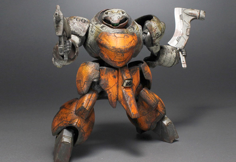 ★★オプションセット9の足を付けました。★ボディパーツにあらかじめキズを付けてから塗装しました。 ★ベースに茶色のサーフェイサーを塗って、シリコンバリアーで実際に剥がす、チッピング塗装をしています。 ★その他、ウォッシング、ドライブラシ、スポンジ等使いウェザリング塗装を施しています。 ★腕パーツは合せ目処理。★足は段落ちモールド処理。★モノアイはシルバーデカールをクリアーグリーンで塗装。