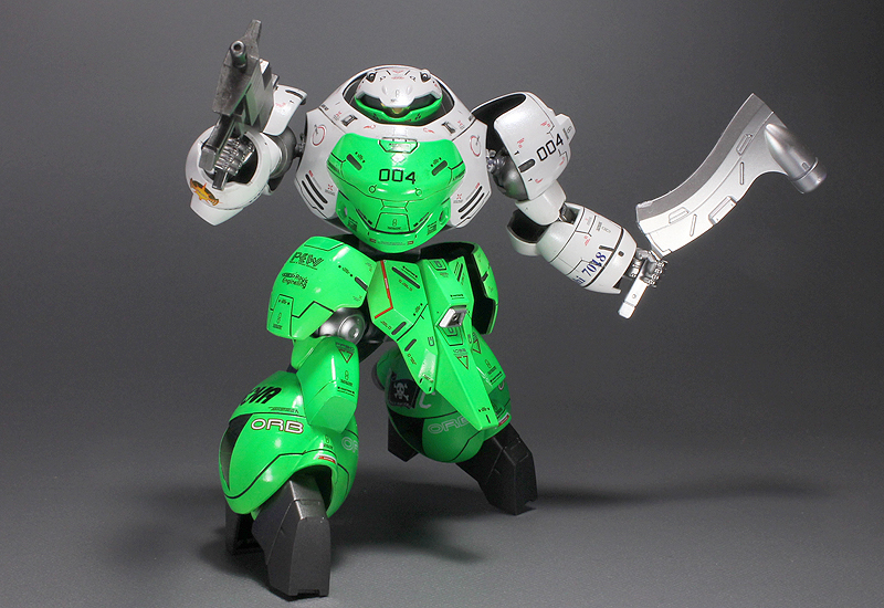 ★オプションセット9の足を付けました。★足と腕パーツは合せ目処理をしています。 ★デカールはストックからテキトーにチョイスし雰囲気で貼りました。 ★ホワイトにはダイヤモンドシルバーでパールコート。グリーンはMr.カラー蛍光グリーンです。 ★デカール貼り後にウレタンクリアーでオーバーコート。スミ入れ。グロス仕上げです。