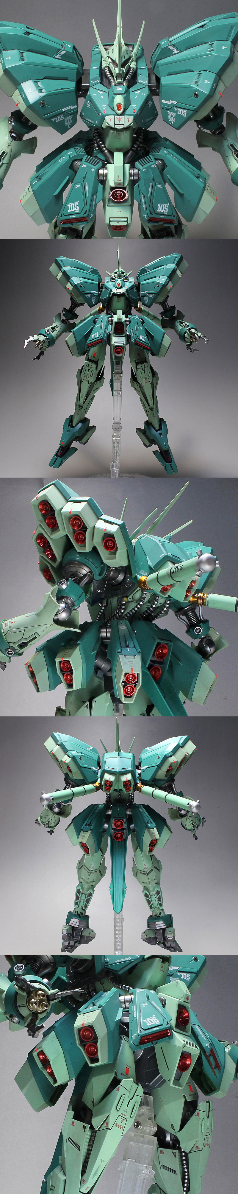 ★ディテールアップはスジボリ、プラ板・プラ棒貼り、ストックパーツ取り付け。細部の金属色にもこだわりました。コーションデカールはおそらく100ヶ所以上貼りました。レッドポイントとメタルパーツも埋め込みました。 ★カラーリングはイエローをオミットしてEXシルバー+スミ入れ。グリーンをブルー系に変更。レッドをキャンディ塗装。
