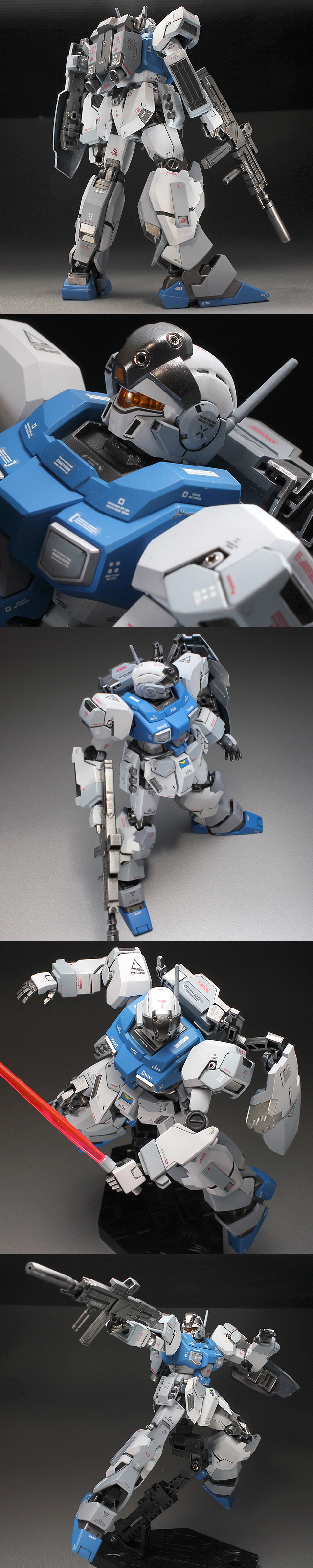 ★連邦のヒロイックなイメージカラー(ブルーとグレー)で仕上げてみました。 ★グレーは明暗の2階調で塗り分けました。★細かいCAUTIONデカールなどを沢山貼りました。 ★チラ見えフレームはガンメタや黒鉄色やメッキシルバーで塗り分け。 ★腰部分の動力パイプはメッキシルバーNEXTで塗装しました。 ★エナメル塗料でスミ入れ。★セミグロスクリヤーでオーバーコートしました。