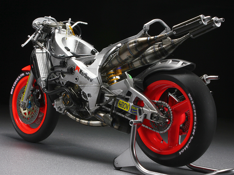 ★基本的にマニュアルに準じた製作です。 ★エンジン、フレーム等の塗装はエナメル系塗料でウォッシング処理を施しています。 ★ブレーキディスク、キャリパー、ステップ等細かいパーツも丁寧に塗り分けました。 ★フロントフォークにミラーフィニッシュを貼りました。★スポンサーデカール(Marlboro)を使用しました。 ★カウルのトップコートはウレタンクリヤー(マルチトップクリヤーSH) ★カウル研出し(ペーパー1000~1500)後→再度ウレタンクリヤー→モデリングワックスで仕上げです。 ☆右側アッパーカウルとセンターカウルの繋ぎ目に接着剤跡があります。☆シールドのデカール(Castrol)がありません。