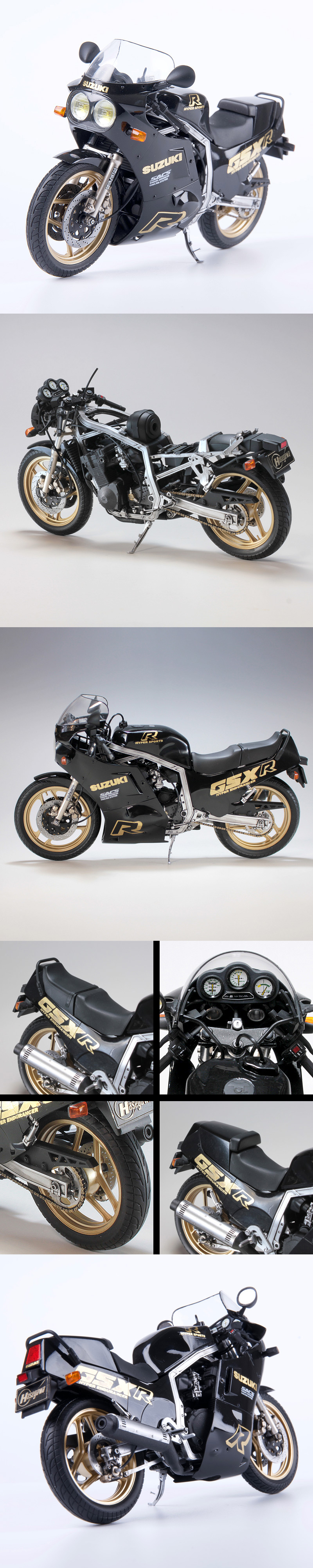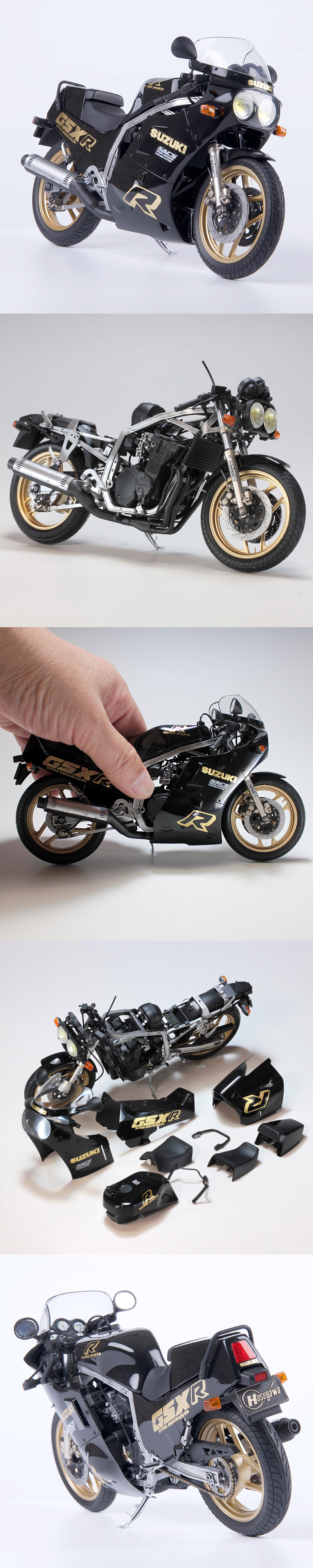 ★基本工作を施して、カラーリング以外は説明書の通りに組立ました。 ★ラッカー系クリアーでオーバーコート→研ぎ出し(鏡面仕上) ★最後にウレタンクリアーでオーバーコート仕上げ。 ★デカールの段差を見立たなくしてあります。★舵取り、タイヤ回転可。 ★カウル・フロントウインカー・タンク・シートはネオジム磁石でホールド(脱着可能) ★ナンバープレート外せます(粘着性のりで仮止め) |
