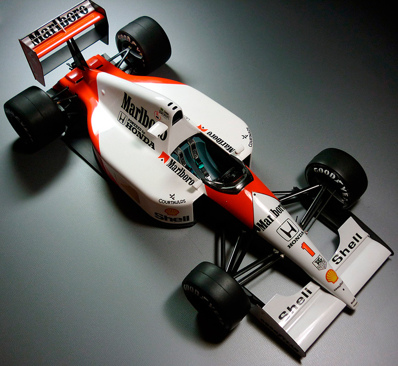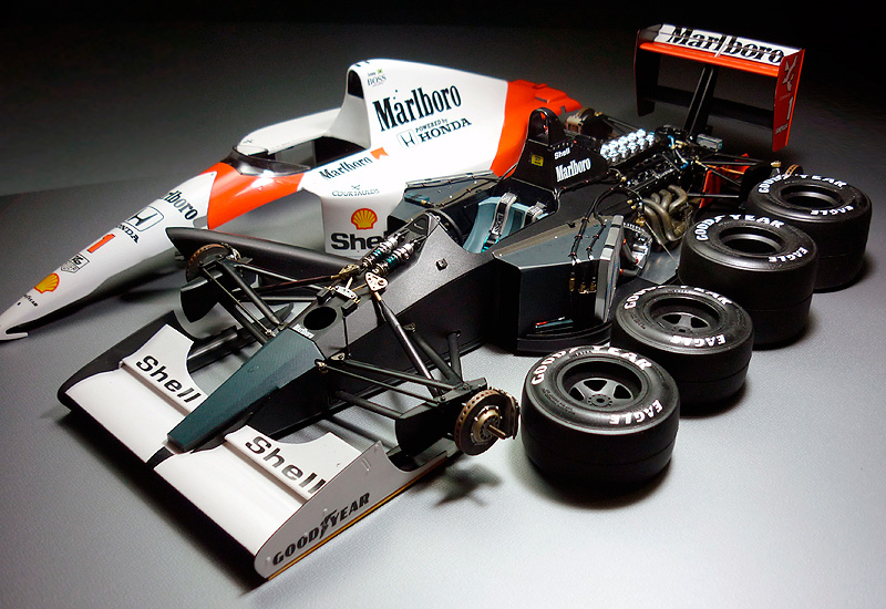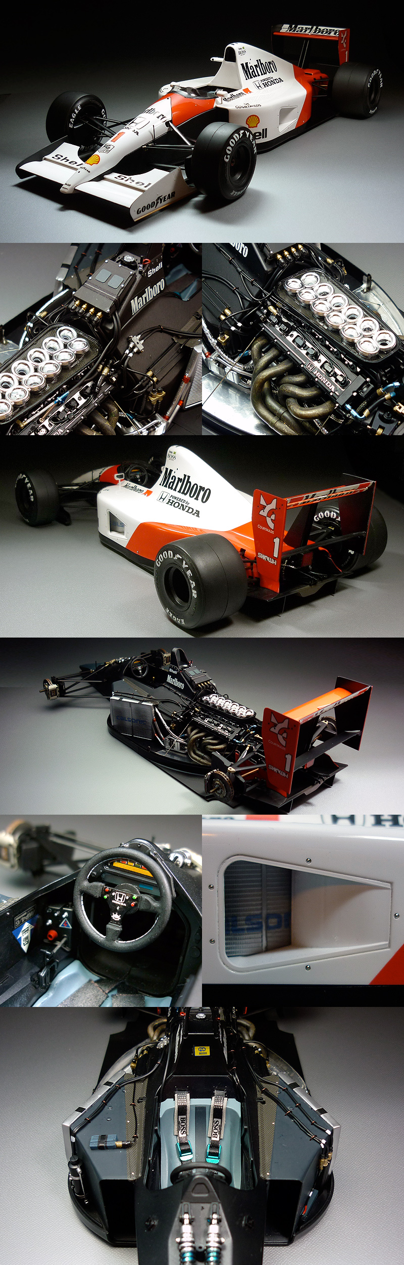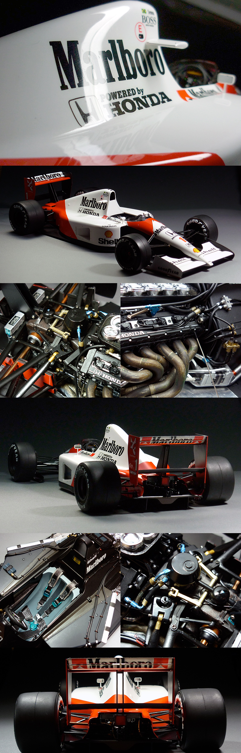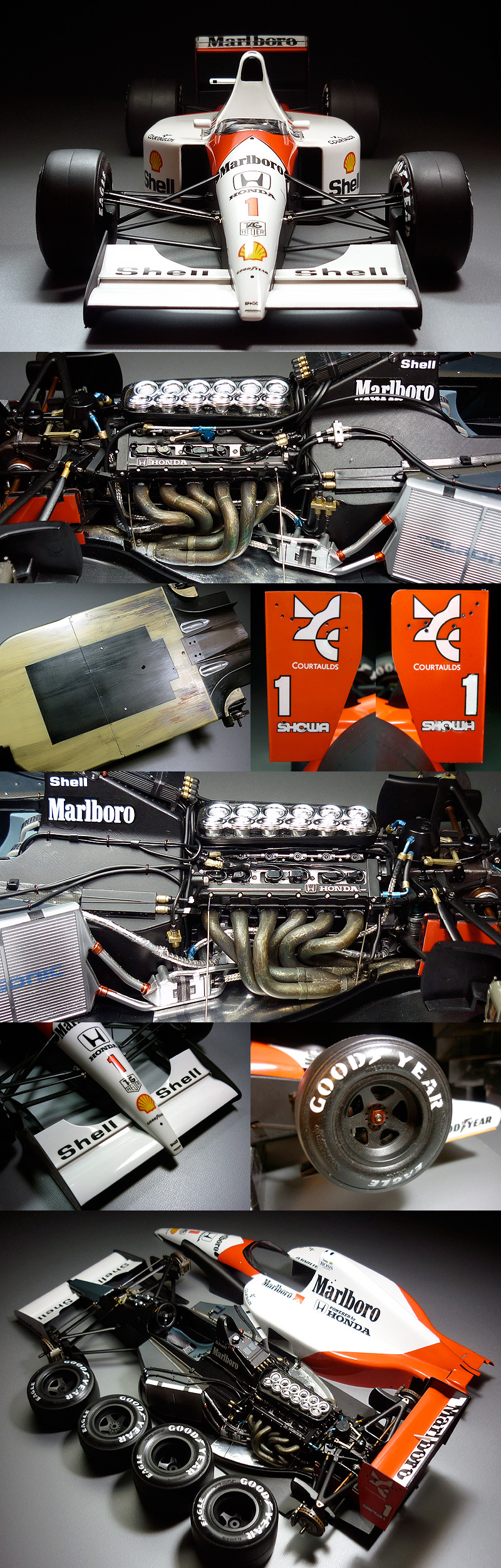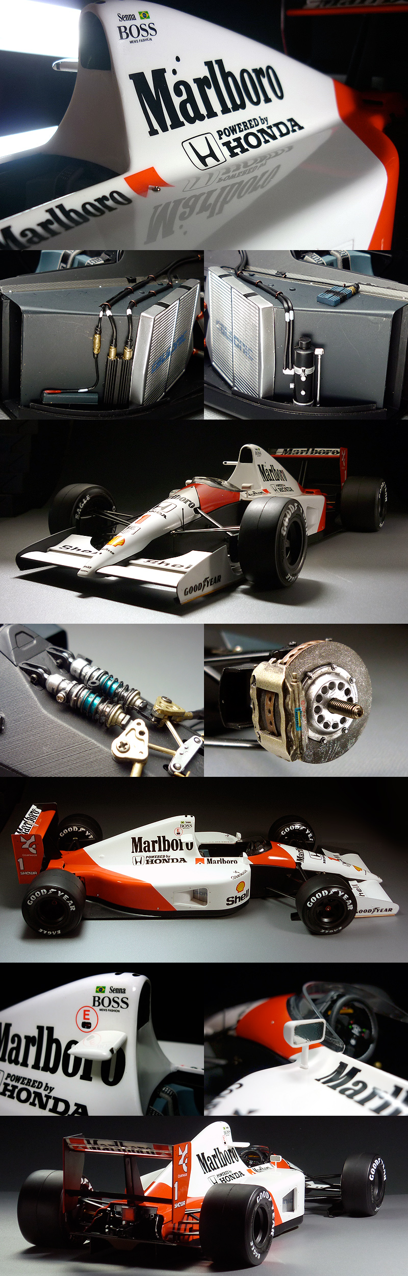 | ★2010年3月に完成★ダンパー:ピストンロッドにメッキシール、クリヤーブールでワンポイント★ブレーキディスク・マフラー・アンダーパネル(車体裏):ウェザリング塗装★ エアーファンネルトレイ・サイドポンツーン:カーボン調デカール★タイヤ:セミグロスブラックで塗装後、デカール貼り、ウレタンクリヤコートを砂吹きし仕上げ。内部にインナー(化学繊維のワタ)を詰めて凹み対策処理★ボディのトップコートはウレタンクリヤー★Mrコンパウンド(液体)粗目→細目→極細の3 段階で磨き上げ★ボディ仕上:セラミックコンパウンド→コーティングポリマー→モデリングワックス(デカールの段差はほとんど気になりません)★ボディにメタボール埋込★モノコック・エンジン・イグニッション周り等のパイピングに力を入れて改修★一部にメッシュコード使用★各補助機器等をスクラッチし装着 ★キルスイッチ・テンションワイヤー追加★テールランプ内にアルミシール★ホイールナットをクリヤーレッドで塗装★ミラーにミラーフィニッシュ(ハセガワ) |