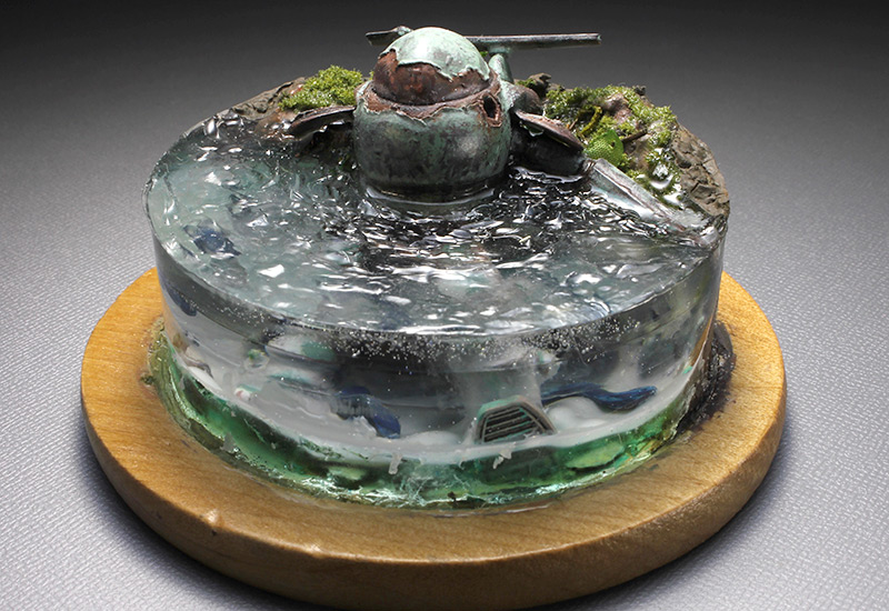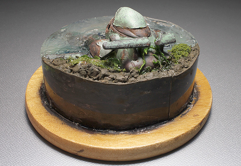 ★マシーネン本体にはダメージ塗装を施しミニジオラマに仕上げました。 ★本体はシリコンバリアーによるチッピング(小傷)塗装と 塗膜のめくれ上がりを表現してダイレクトカット塗装をしています。 ★水の表現には透明樹脂を使いました。しかし2種類の水素材を使用したため、 化学反応が起こり水底に白いモヤのようなモノが出来てしまい、透明度が無くなりました。 ★そのため水表面に漣(さざなみ)を作ってごまかしました(笑) ★水中はダメですが、水上に出ている部分だけみれば、まあまあな感じです。