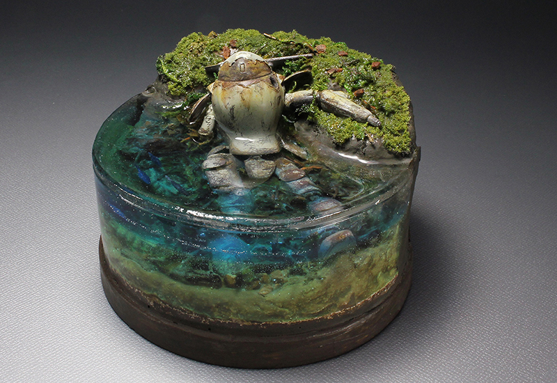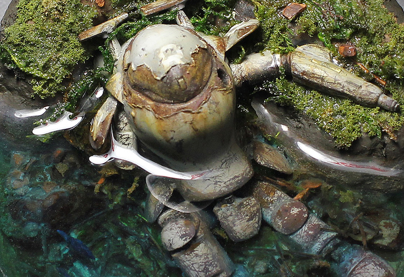 ★マシーネン本体にはダメージ塗装を施しミニジオラマに仕上げました。 ★本体はシリコンバリアーによるチッピング(小傷)塗装と塗膜のめくれ上がりを表現してダイレクトカット塗装をしています。 ★水の表現には透明樹脂を使いました。水底の樹脂には色を付け、澄んだ水の表現が上手く出来たと思います。