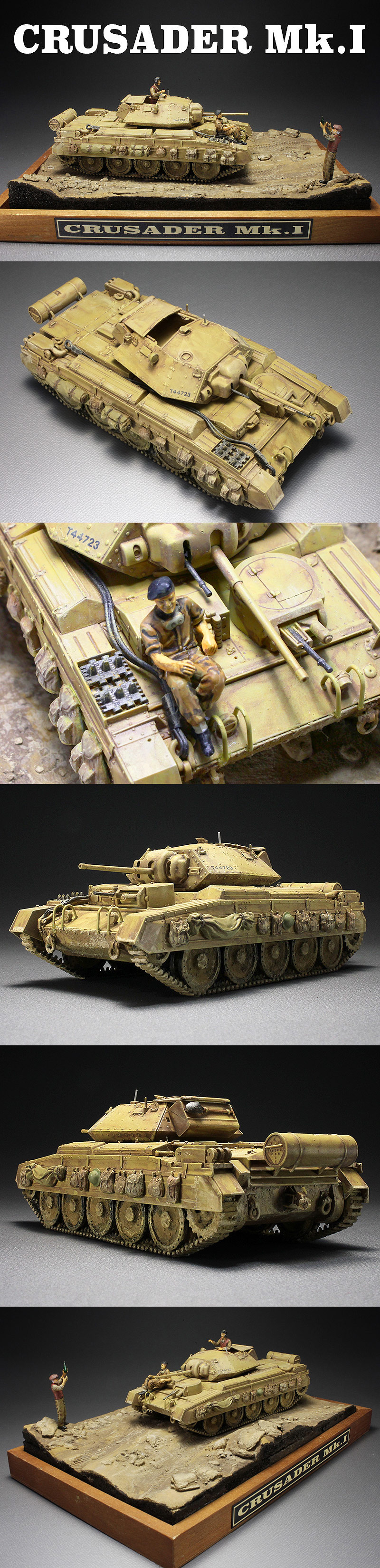 ★クルセーダーMk.I仕様で作成しました。 ★基本塗装を施して、エナメルブラウン等でウォッシング〜ドライブラシでハイライトを入れました。 ★車輪にMr.ウェザリングペーストを盛り~荷物を塗り分け。 ★ビネットと更にフィギュアを追加。